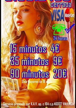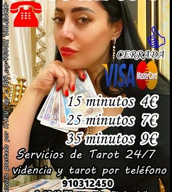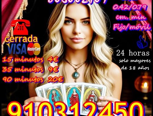 806002109 0,42/0,79 cm € min red fija/móvil. LÍNEA DE TAROT Y VIDENCIA CON TARIFA CERRADA 910312450- 4 EUROS 15 min-EXPERTAS EN AMOR, TRABAJO, ECONOMIA LAS 24/7