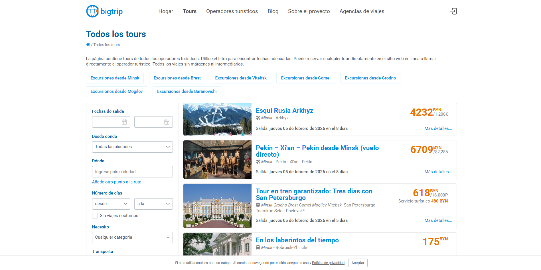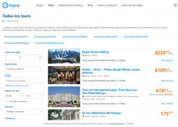 El servicio bigtrip.by — es una plataforma en línea para seleccionar excursiones y recorridos en autobús de todos los operadores turísticos de Bielorrusia. Recopilamos viajes actuales de 122 operadores turísticos y mostrar contacto directo con los operadores en cada tour a pedido. El proyecto bigtrip.by no es una agencia de viajes, no vendemos tours. Pero en nuestro sitio web puedes hacerlo envíe una solicitud en línea para un recorrido, llame o pague inmediatamente el recorrido directamente al operador turístico.