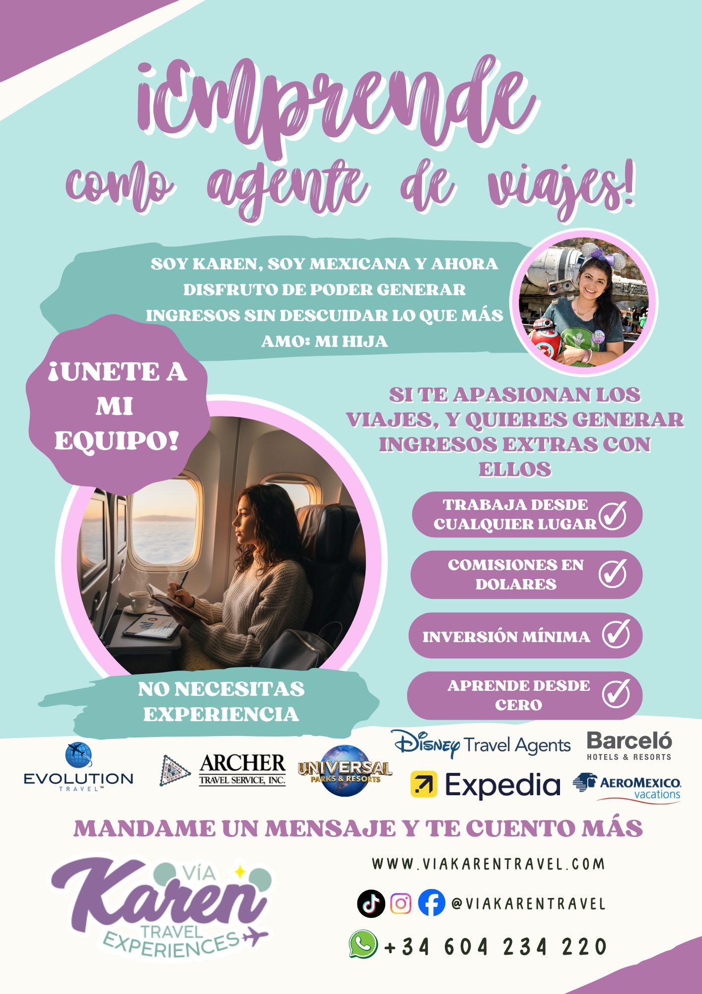 Emprender como agente de viajes independiente en un modelo que te permite trabajar a tu ritmo, desde donde quieras, con el respaldo de más de 130 proveedores internacionales como Disney, Royal Caribbean, Universal, Expedia, RIU y muchos más. Además del respaldo de una agencia con mas 70 años en la industria.